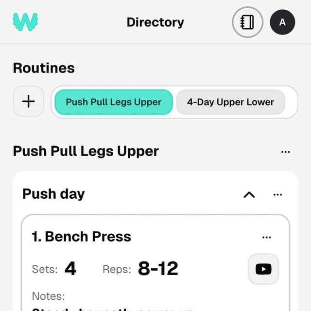 A workout builder and logger where you can track weights, create exercises, group them into workouts and routines, and browse embedded YouTube videos. Built as a PWA for home screen access and fullscreen view.