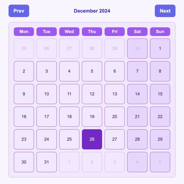 A responsive React calendar with a clean grid layout. Built using TailwindCSS and date-fns, it supports date navigation and can be easily extended for event scheduling or productivity tools. Designed to be lightweight, flexible, and developer-friendly.